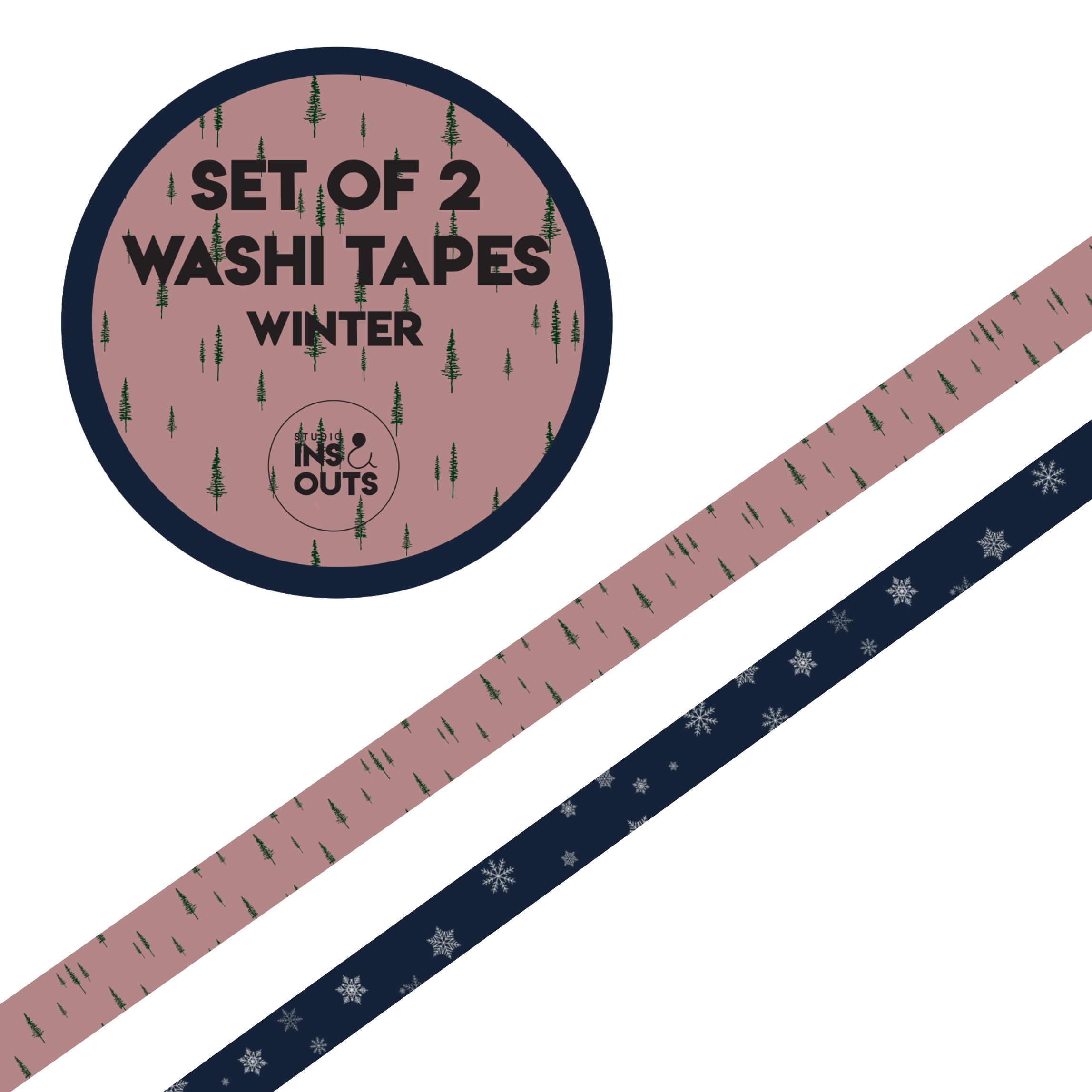 De Set van 2 Washi Tapes Winter’25 van Studio Ins & Outs brengt een knusse wintersfeer in je creatieve projecten. Deze stijlvolle set bestaat uit twee tapes in harmonieuze kleuren: een zachte roze tint met groene dennenbomen en een diepblauwe tape met witte sneeuwvlokken. Perfect om je invulboek, scrapbook, fotoboek of winterjournal een warme en seizoensgebonden uitstraling te geven.