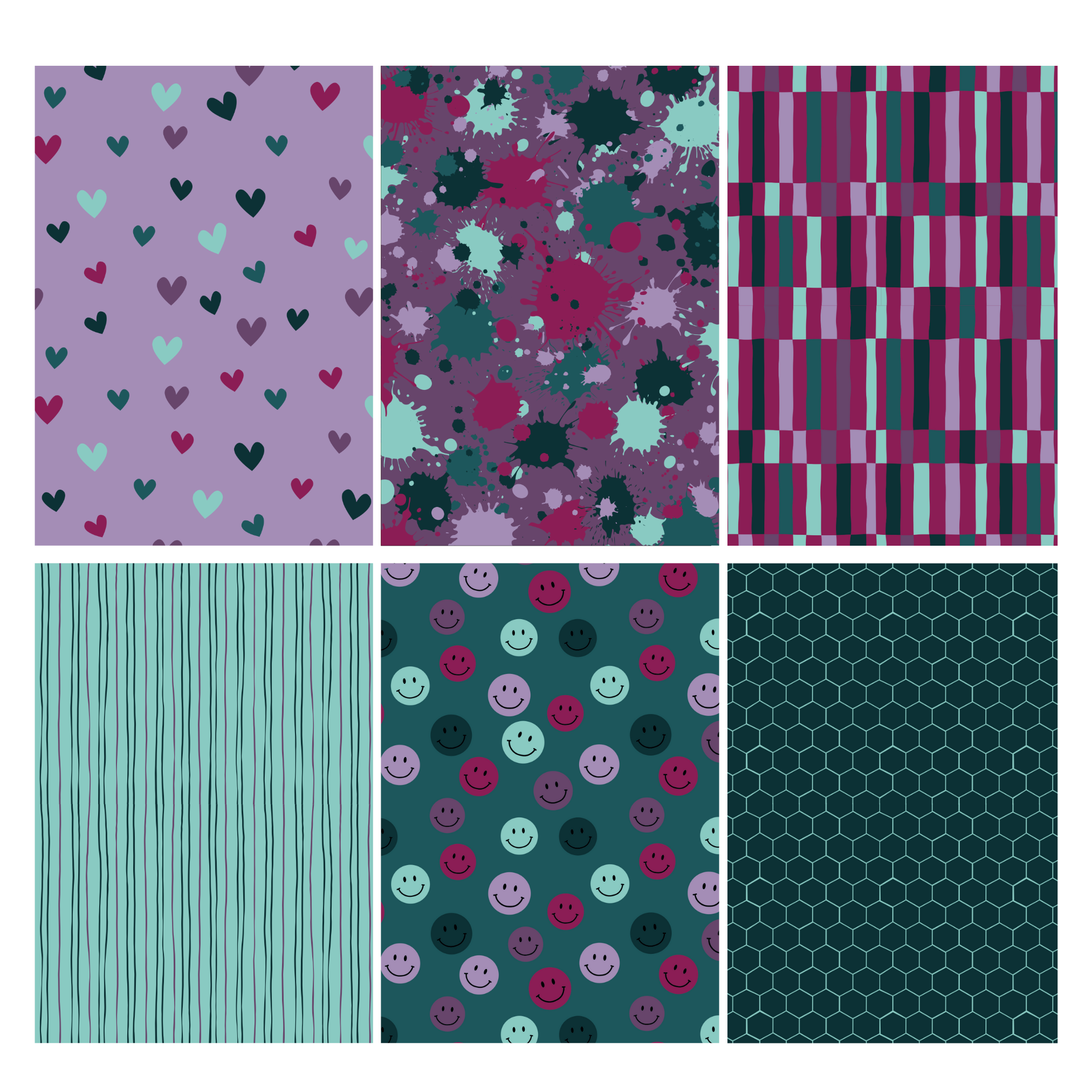 De set bestaat uit zes harmonieuze kleuren: paars, lila, bordeaux, donkergroen, mintgroen en petrolgroen. De prints zijn gevarieerd en sfeervol: van lieve hartjes en vrolijke smileys tot verfspatten, grafische strepen en zachte texturen. Deze mix van patronen en cozy teksten zorgt voor een eigentijdse, ontspannen stijl waarmee je jouw creatieve momenten helemaal in het teken van selfcare kunt zetten.