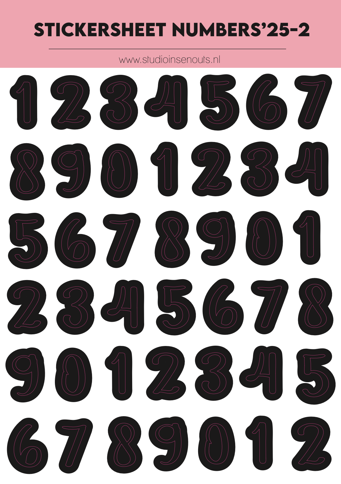 Het tweede stickervel bevat meerdere herhalingen van de cijfers 0 t/m 9 in een retrolettertype met dikke lijnen, perfect als stoer accent op kleurrijke achtergronden of in combinatie met tape en kaders.