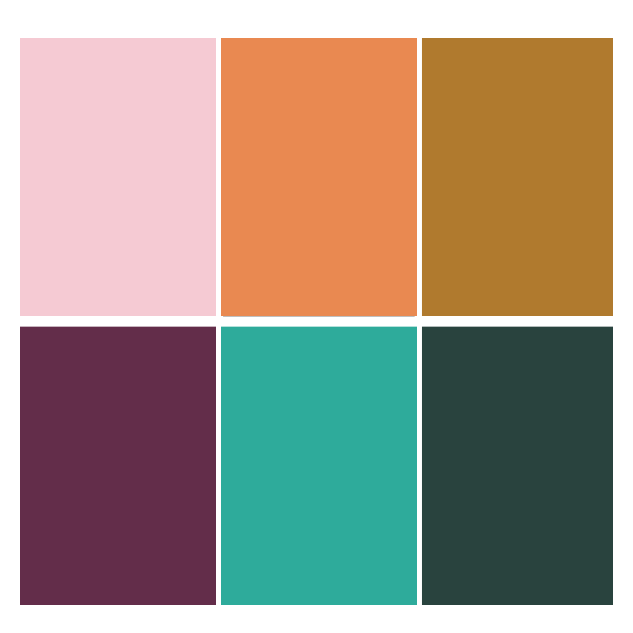 - Kleuren: roze, oranje, oker, pruim, turquoise, donkergroen