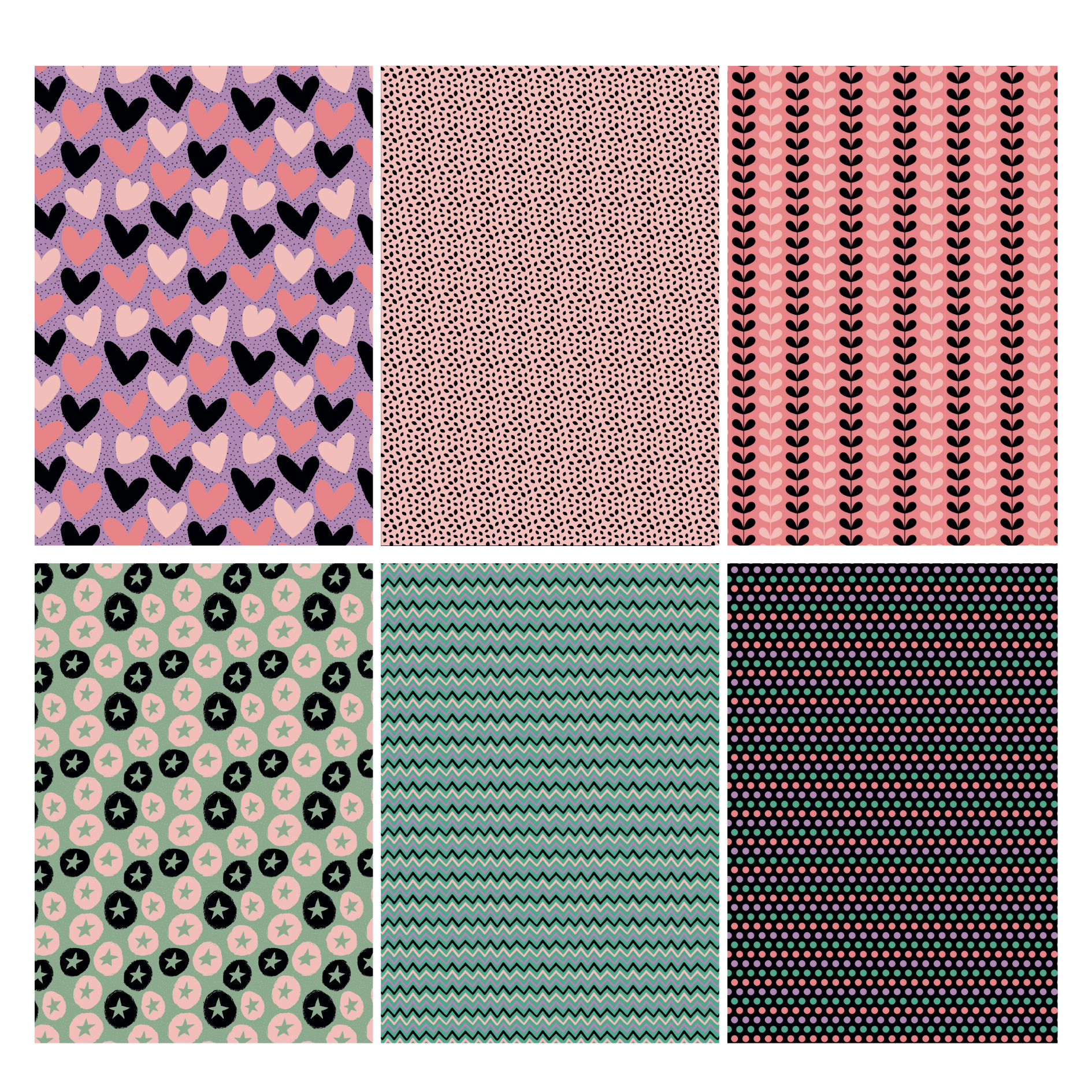 Dit Cozy paperpad bevat 24 vellen scrapbook papier samengesteld uit een kleurpalet van lila, roze, zalmrood, mintgroen, grijsgroen en zwart. De printjes hebben een vrolijke en speelse uitstraling met hartjes, stippen, zigzaglijnen en grafische patronen.