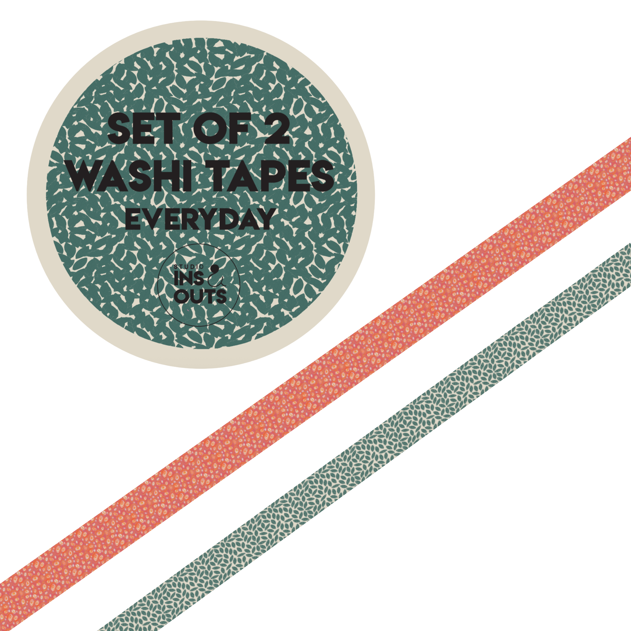 Washi tapes set van 2: Eén tape met frisse confetti-motiefjes en één met grafisch bladpatroon — perfect voor accenten, journaling en randafwerking.