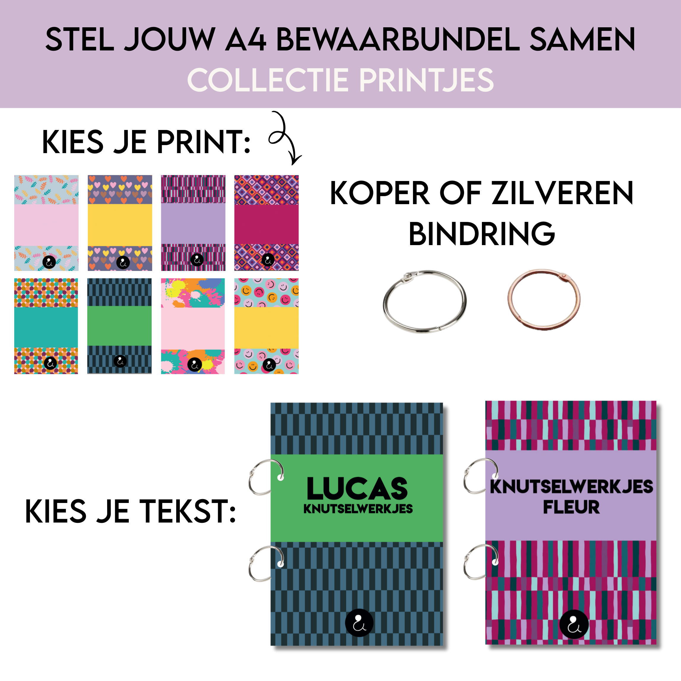 Deze bewaarbundel is volledig custom made en wordt speciaal voor jou samengesteld. Je kiest zelf het patroon van de kaft, de kleur van de band, de tekst op de voorkant en zelfs de kleur van de ringen. Zo ontstaat een unieke bewaarbundel die perfect past bij jouw smaak en bij het kind waarvoor de bundel bedoeld is. Door deze persoonlijke samenstelling wordt de knutsel bewaarbundel niet alleen functioneel, maar ook een blijvende herinnering die je met plezier bewaart en gebruikt.