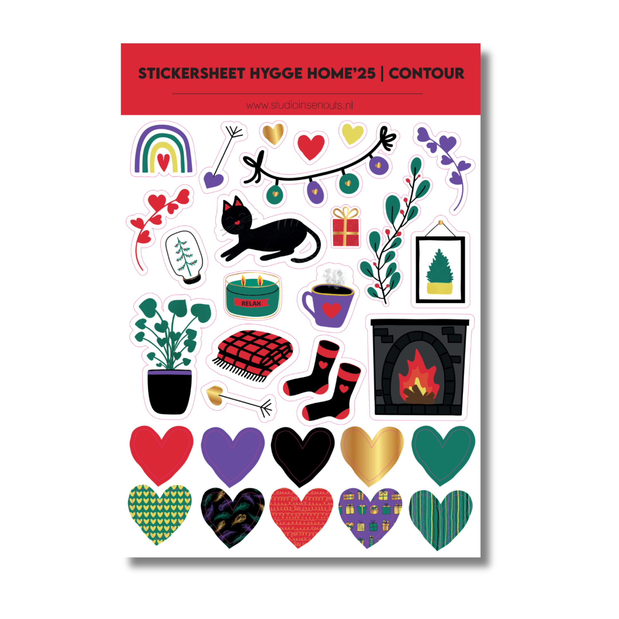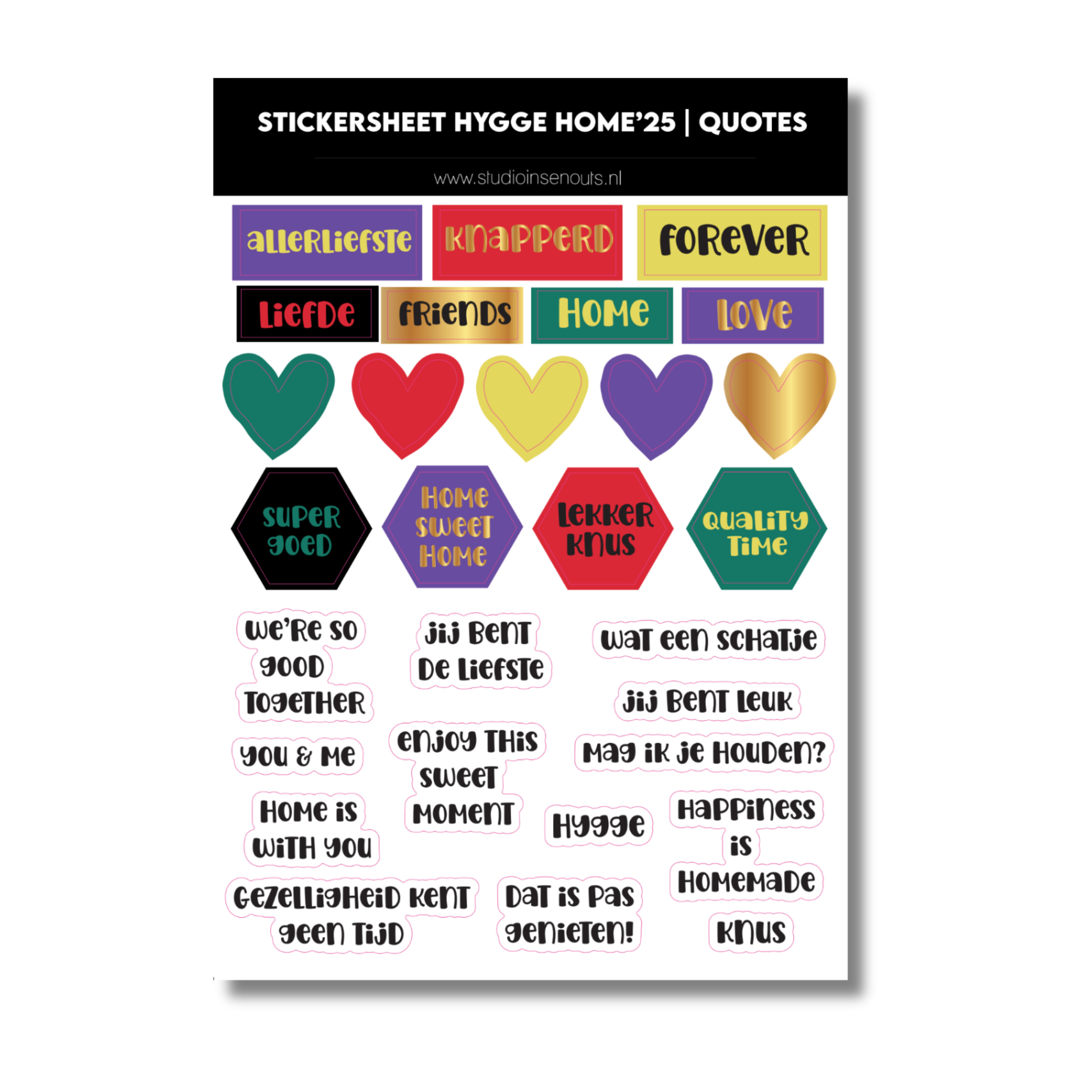 Stickervellen: Vier verschillende stickervellen met cirkelvormige, contour-, frame- en quote-stickers. Denk aan teksten als “Knuffeltijd”, “Thuis is bij jullie”, “Lekker knus zo” en “Happiness lives here”. De combinatie van goudfolie, warme tinten en illustraties van kopjes, kaarsen en dekens brengt direct een gezellig hygge-gevoel.