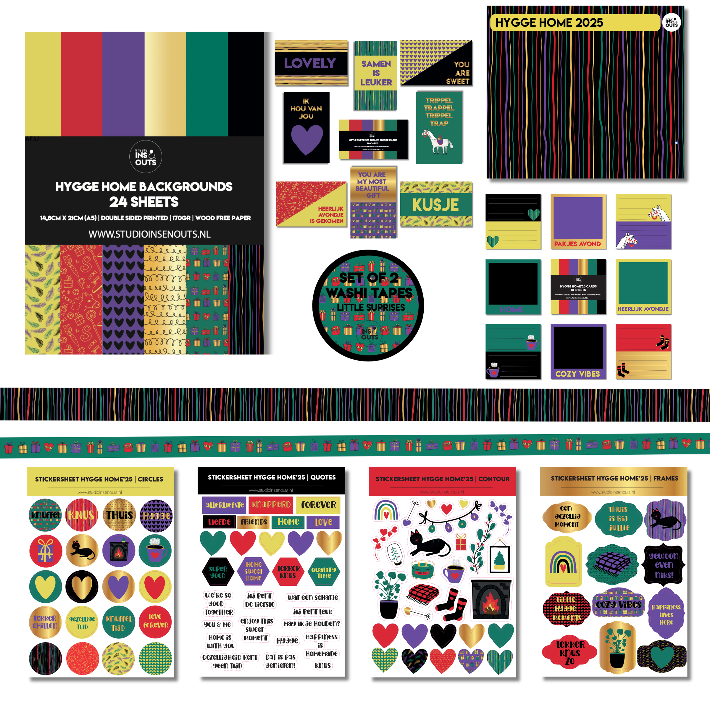 De Hygge Home’25 collectie van Studio Ins & Outs is ontworpen voor iedereen die houdt van warme avonden, gezellige momenten en creatieve ontspanning. Deze complete scrapbook set bevat alles om sfeervolle journalingpagina’s, fotoboeken en invulboeken te maken. Dankzij de diepe kleuren, gouden accenten en knusse patronen krijgt elk project een stijlvolle, winterse uitstraling.
