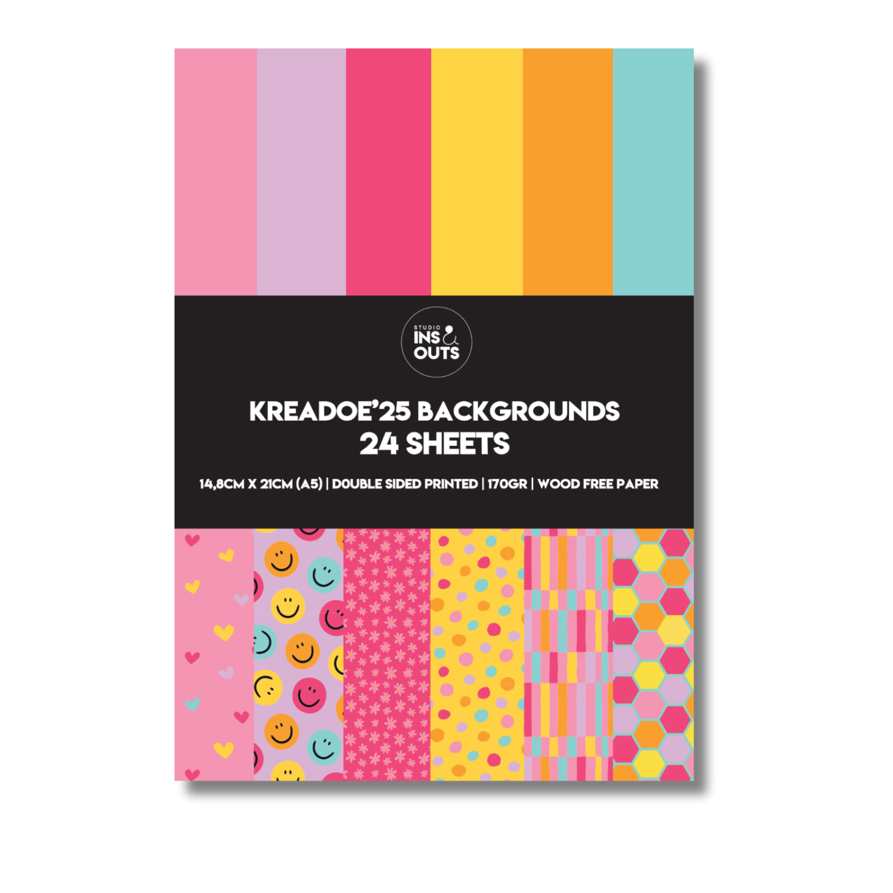 Paperpad: Het A5-paperpad bevat 24 dubbelzijdige vellen (170 grams papier) met opvallende patronen zoals hartjes, smileys, stippen en kleurrijke strepen. Perfect als basis voor je layouts.