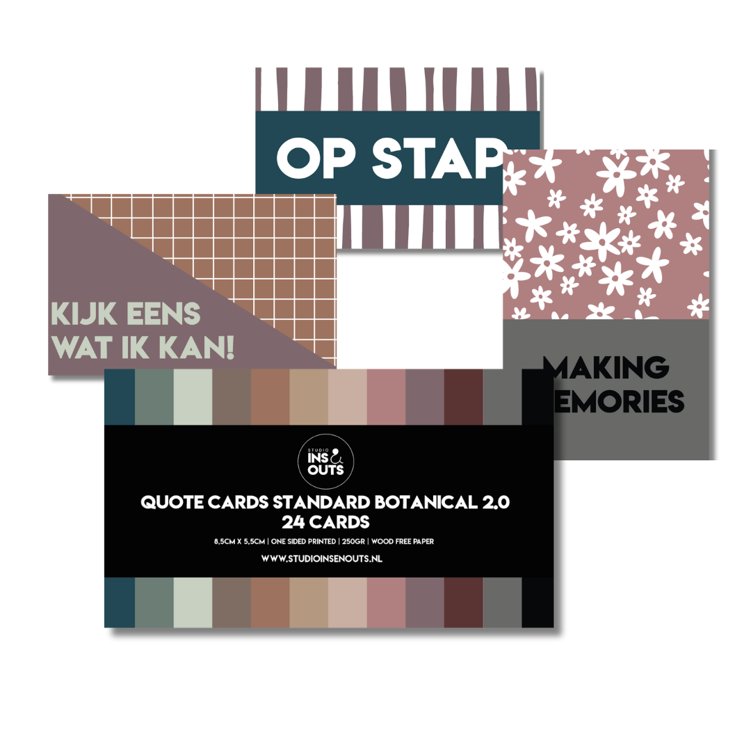De 24 quote cards bevatten korte teksten zoals “Kijk eens wat ik kan!”, “Making memories” en “Op stap”. Alle teksten zijn in het Nederlands en gedrukt op stevig papier in bijpassende kleuren. Ideaal als decoratief accent of om toe te voegen aan een kaart of cadeau.