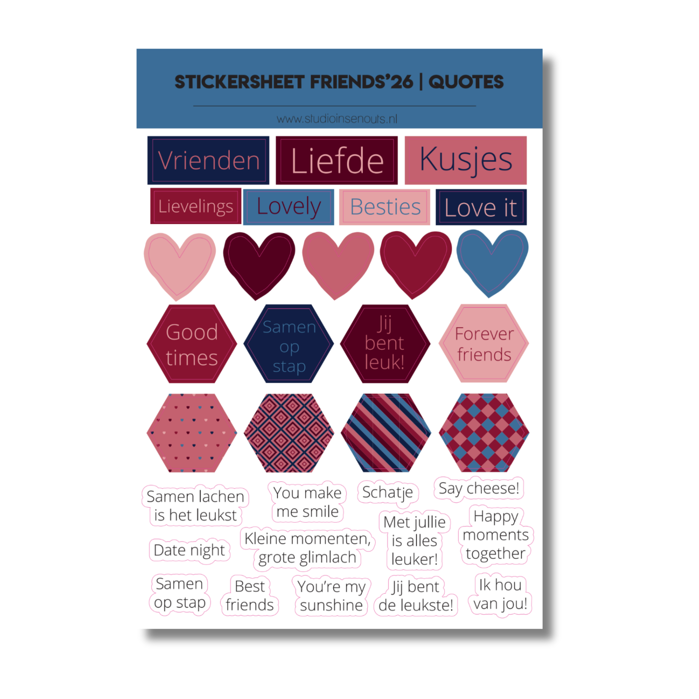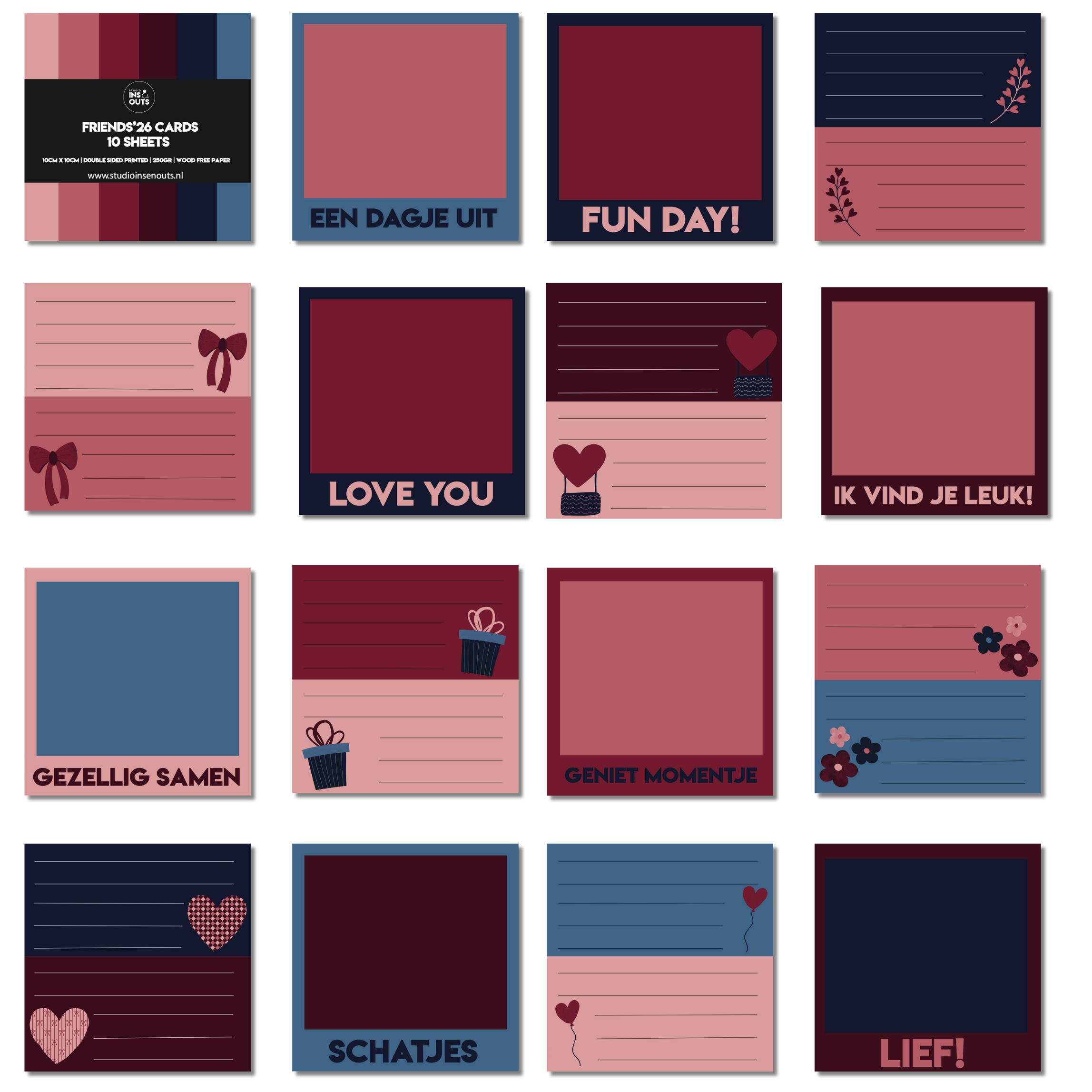 De Friends’26 collectie van Studio Ins & Outs is een compleet scrapbook pakket voor het vastleggen van momenten met vrienden en mensen die belangrijk voor je zijn. Deze set is samengesteld voor pagina’s over vriendschap, samen leuke dingen doen, herinneringen maken en dagelijkse momenten. De collectie bevat een paperpad, stickers, washi tapes en kaartjes in een herkenbaar kleurenpalet van lichtroze, oudroze, rood, bordeaux, blauw en donkerblauw. Geschikt voor scrapbooking, journaling, invulboeken en fotoboeken.