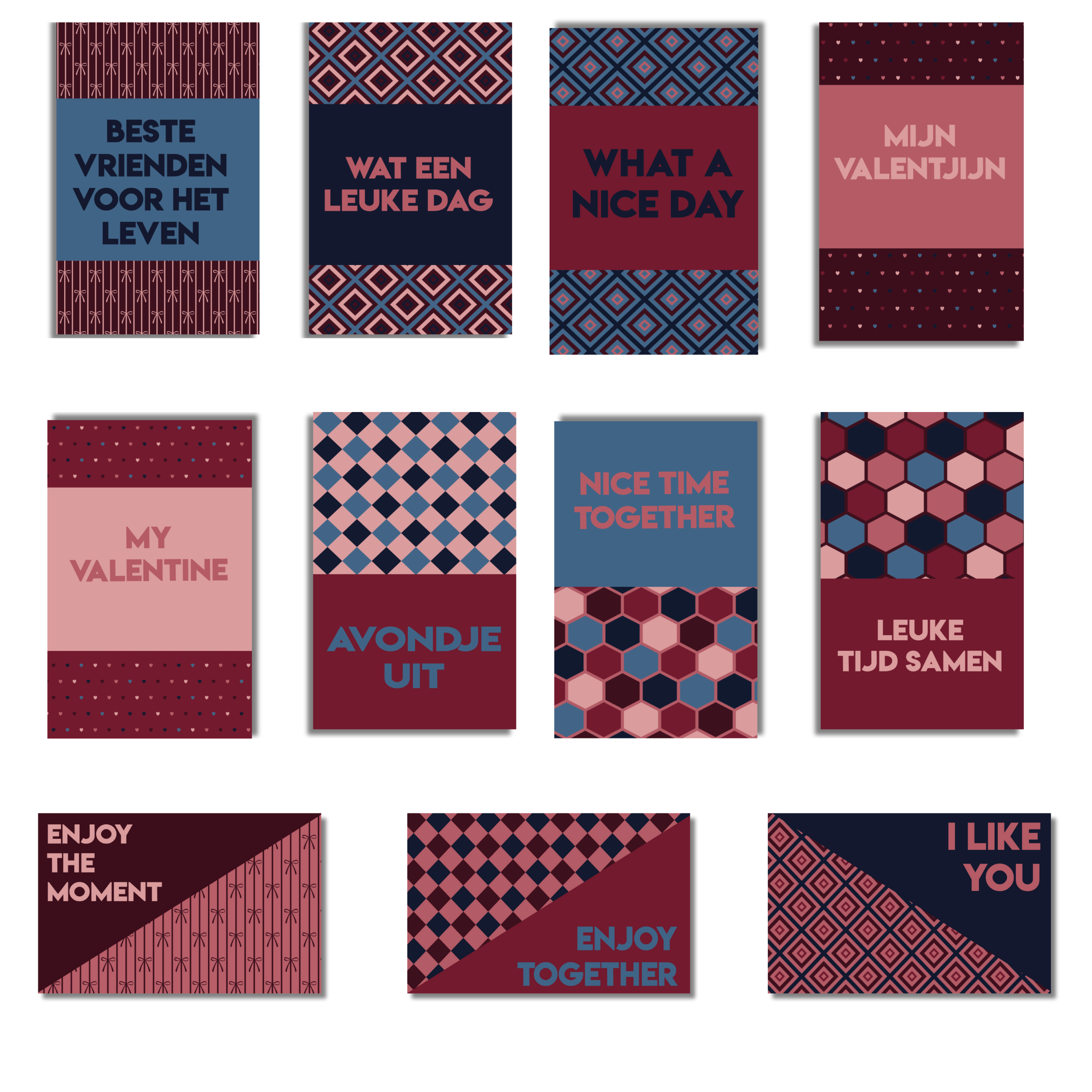 Decoratieve kaartjes met korte, warme teksten zoals “LOVE YOU”, “LIEF!”, “IK VIND JE LEUK!”, “GEZELLIG SAMEN”, “FUN DAY!” en “GENIET MOMENTJE”