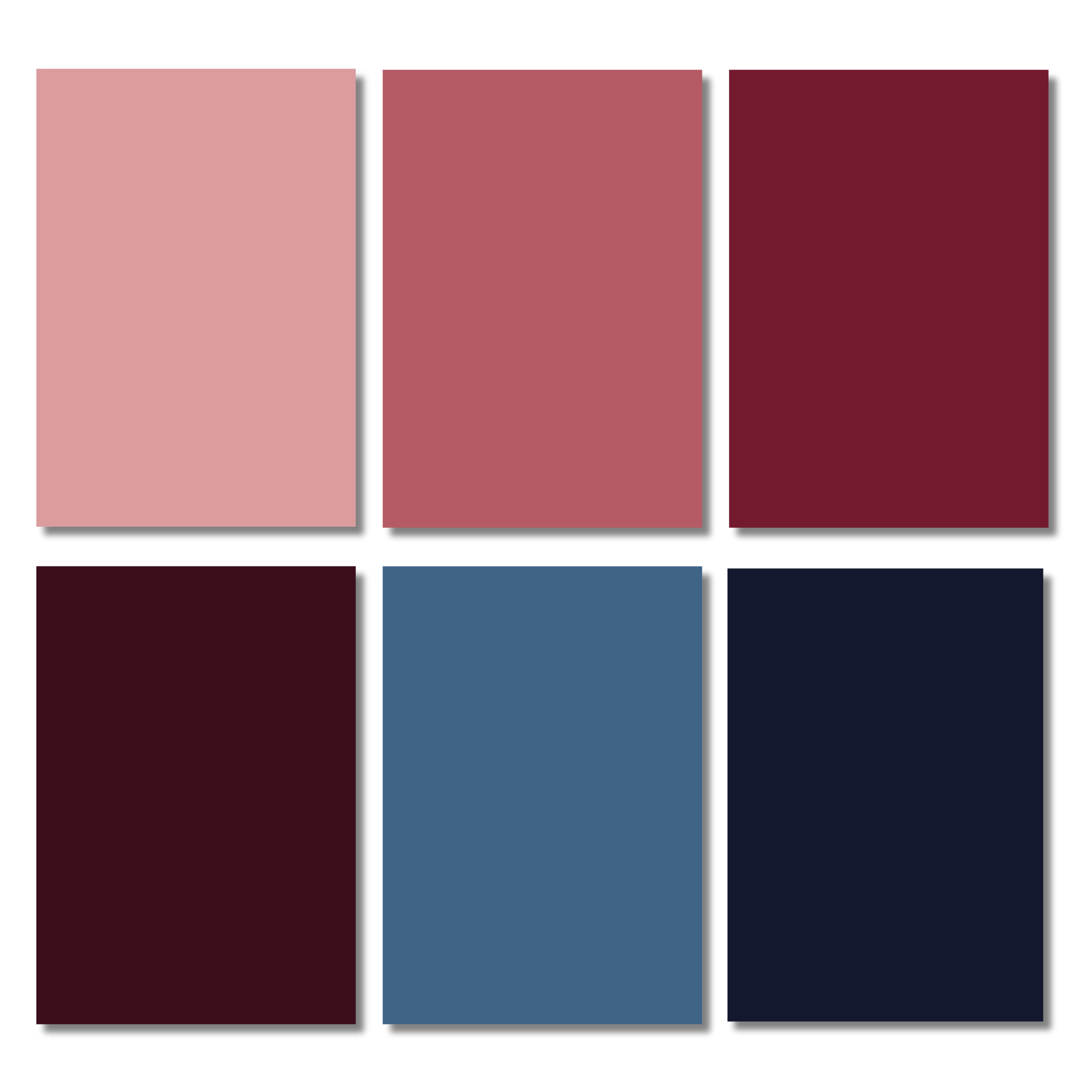 • Kleuren: lichtroze, oudroze, rood, bordeaux, blauw en donkerblauw