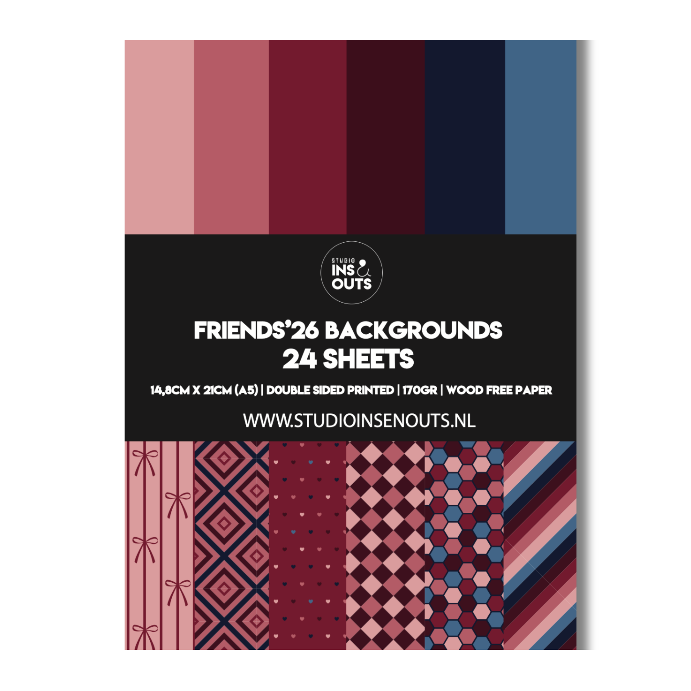 • Paperpad: 24 dubbelzijdige vellen (14,8 × 21 cm) met patronen zoals hartjes, ruiten, hexagon, strikjes, strepen en hokjes in het Friends’26 kleurenpalet.