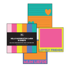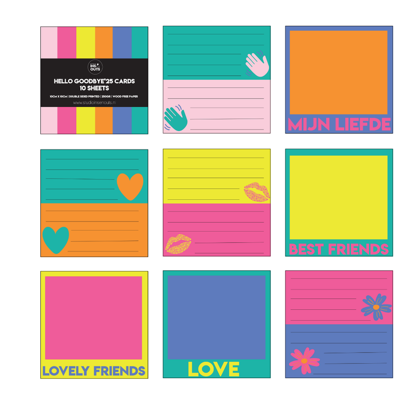 Deze set bevat tien kaartjes in polaroidvorm met ruimte om een foto of korte herinnering in te plakken. Elk kaartje heeft een andere kleur of print uit de Hello Goodbye collectie, zoals turquoise hartjes of oranje strepen. De uitgesproken randen en kleuren maken ze perfect geschikt als kader voor je favoriete moment.