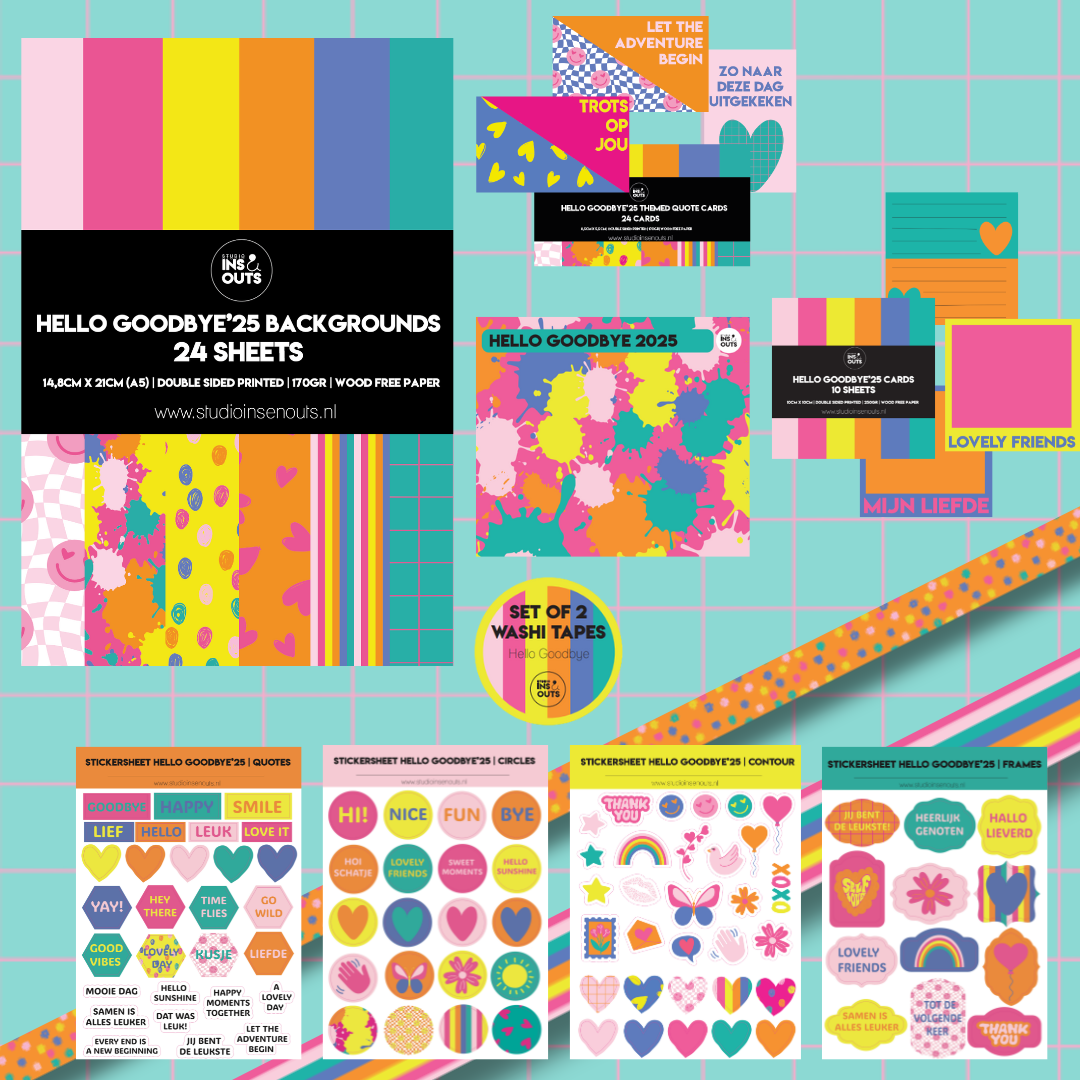 De collectie Hello Goodbye'25 draait om vrolijke overgangen, nieuwe hoofdstukken en betekenisvolle momenten zoals afscheid nemen, een nieuw avontuur beginnen of iemand aanmoedigen. Elk onderdeel uit deze set is ontworpen om een warme en positieve sfeer over te brengen. Daarnaast bevat de set ook mooie, lieve en leuke teksten die je altijd kunt gebruiken in je invulboek, plakboek of scrapbook.