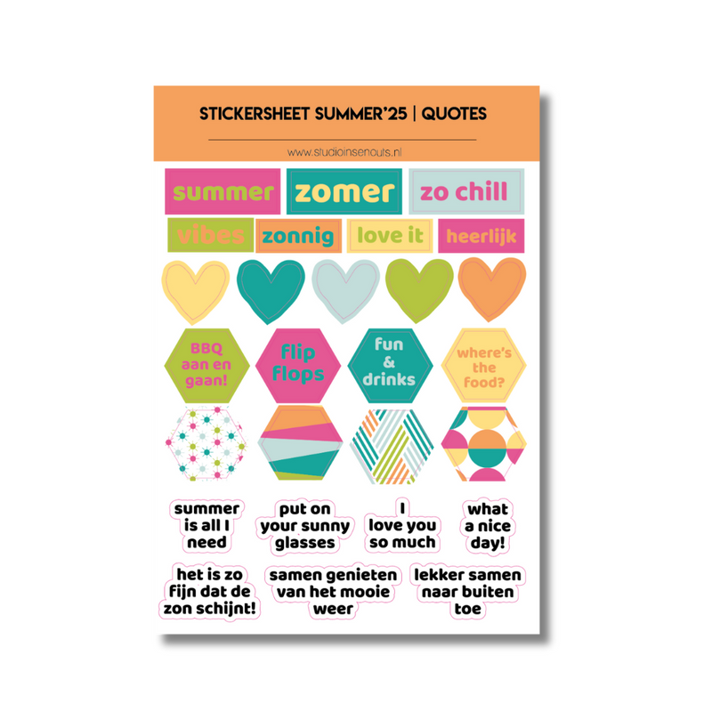 De set bevat 24 quote cards met korte teksten in het Nederlands en Engels, zoals "I love this day with you" en "So happy to be here with you". De kaartjes zijn bedrukt in de zomerse kleuren van Summer’25 en voorzien van speelse grafische vormen. Ideaal als eyecatcher of om cadeau te geven.