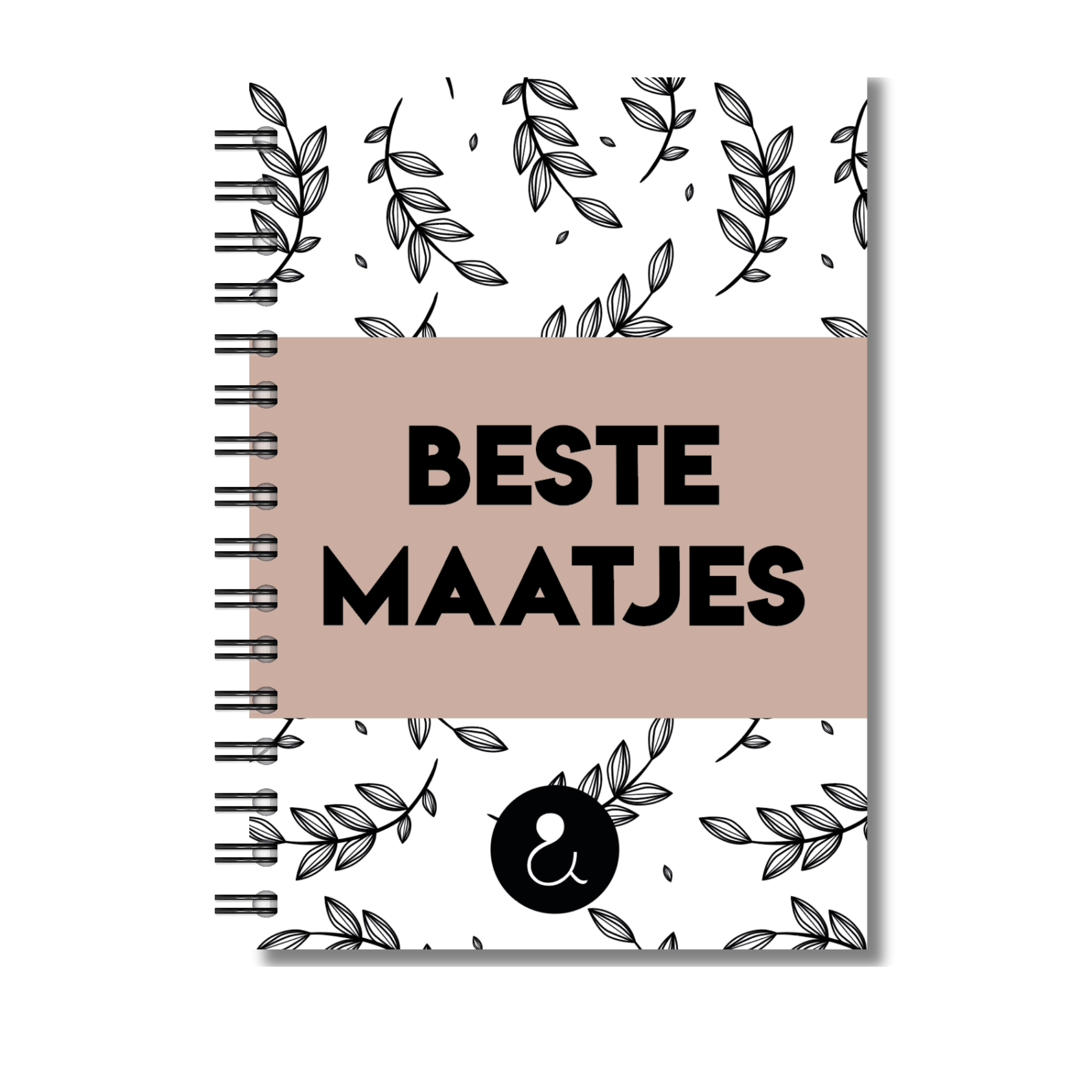 • Omslag: Botanical blaadjes print met sandkleurige band en tekst 'Beste Maatjes'