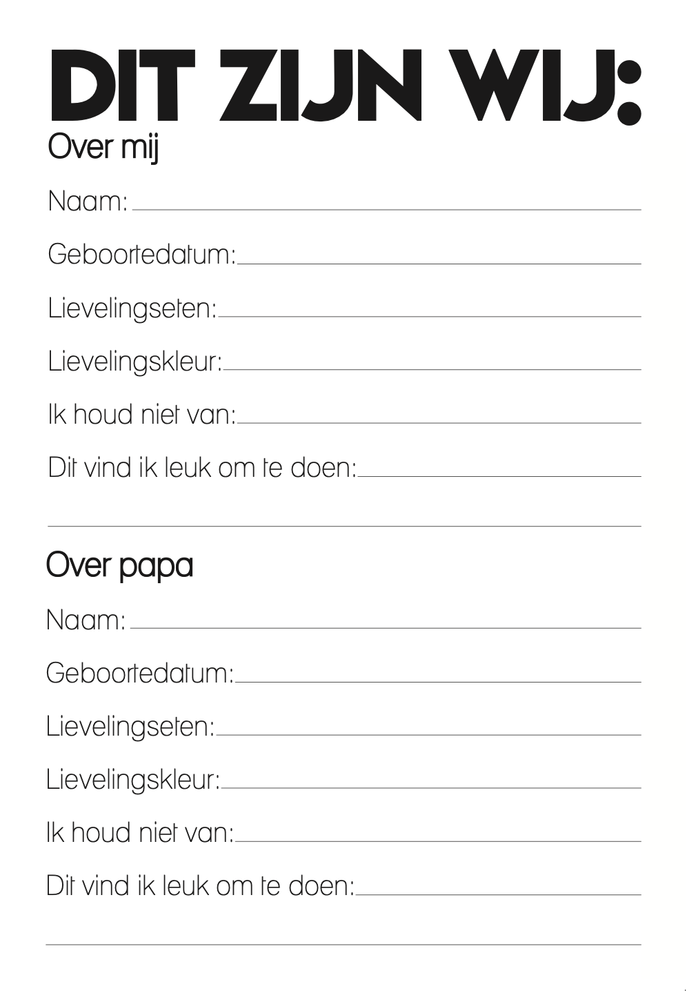 - Voorin ruimte om jullie voor te stellen: ‘Dit zijn wij’, met invulpagina’s over papa en over het kind