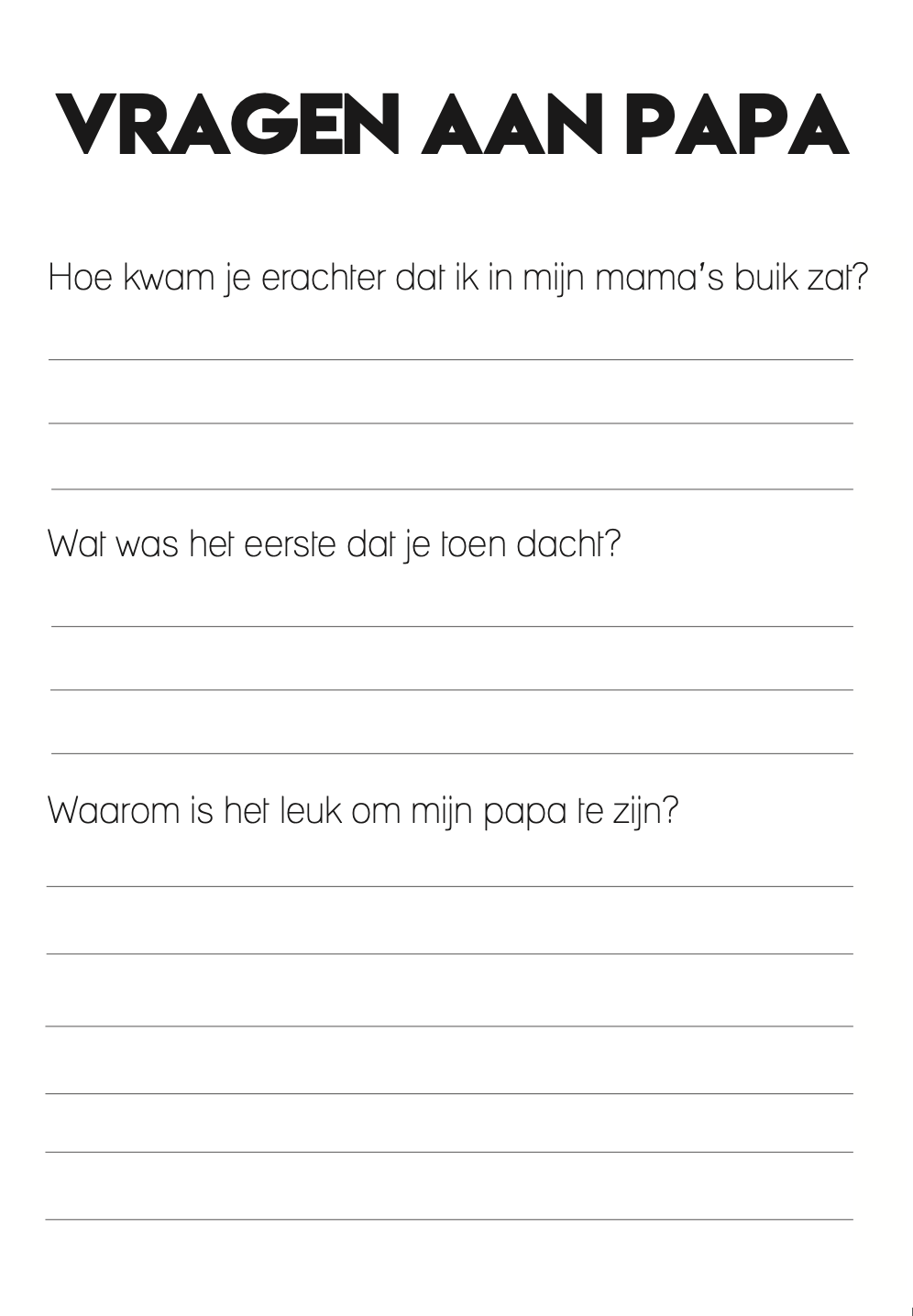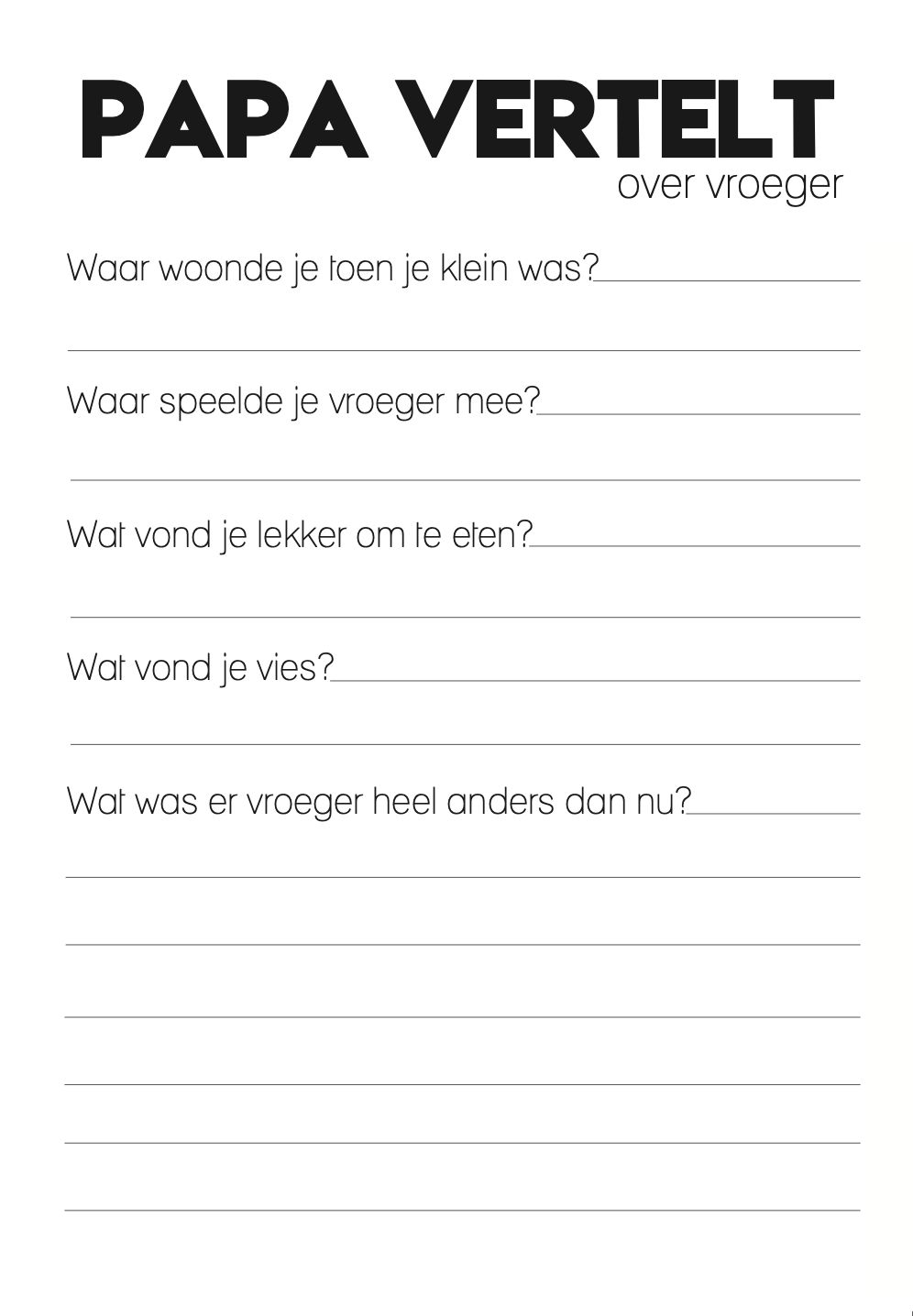 - Vragen aan papa over vroeger: waar hij woonde, wat hij leuk vond, wat hij wens voor zijn kind en meer