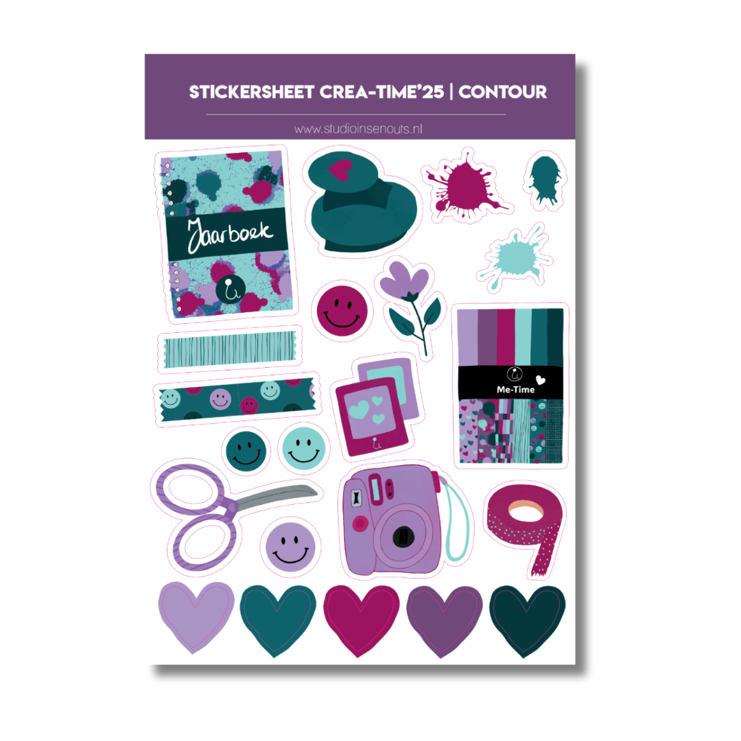 - Stickervel Contour met creatieve figuren zoals een camera, schaar, smileys, bloemen, hartjes en journaling-elementen