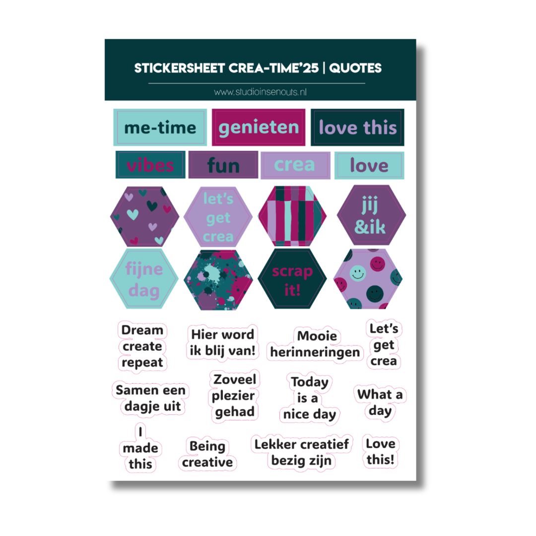 - Stickervel Quotes met teksten als “scrap it!”, “let’s get crea”, “being creative” en “hier word ik blij van”