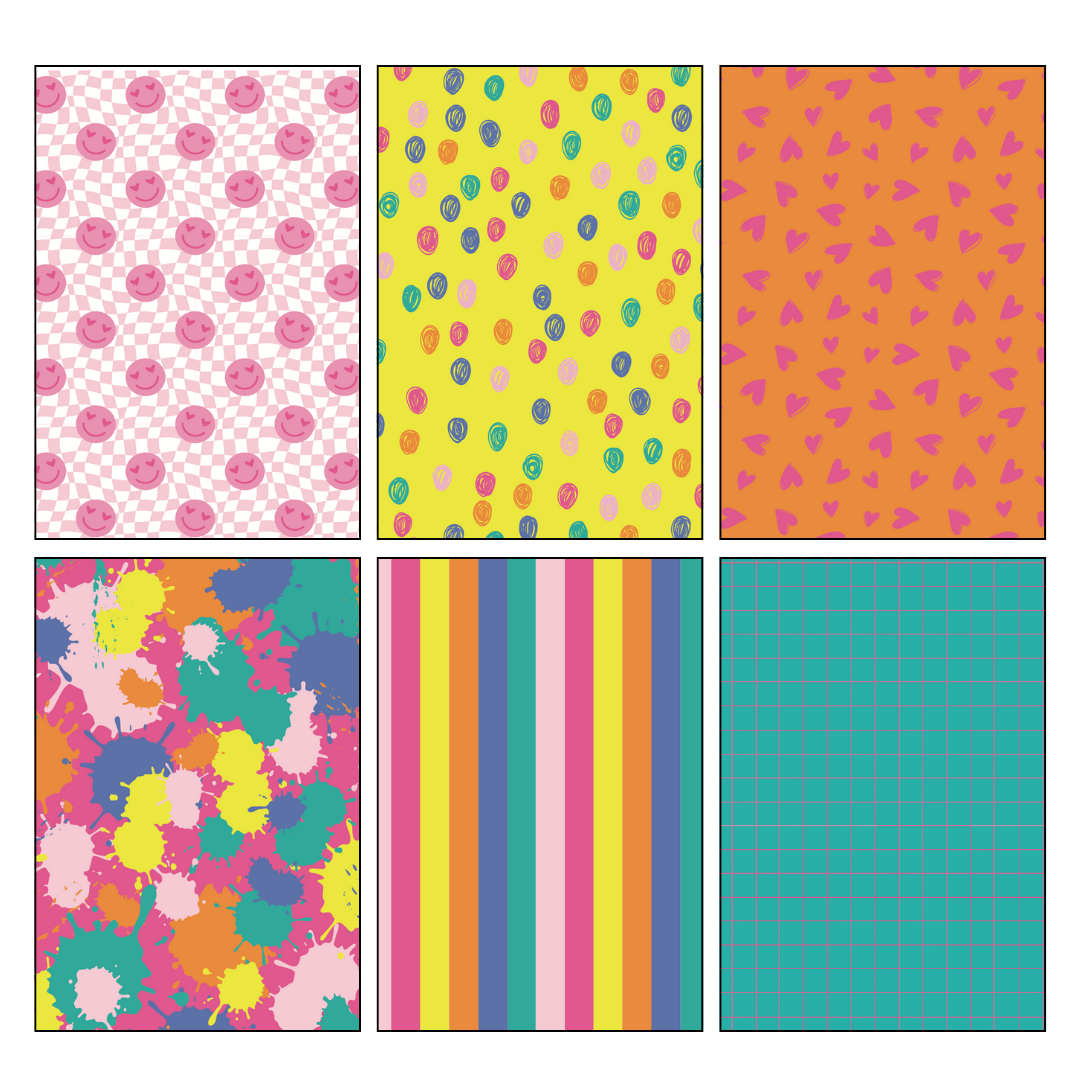 De printjes variëren van lachende smileys op een roze ruitpatroon, kleurrijke verfspatten, confetti en stippen tot oranje hartjes, regenboogstrepen en een turquoise ruitpatroon. Zo geef je elk project eenvoudig een unieke uitstraling.