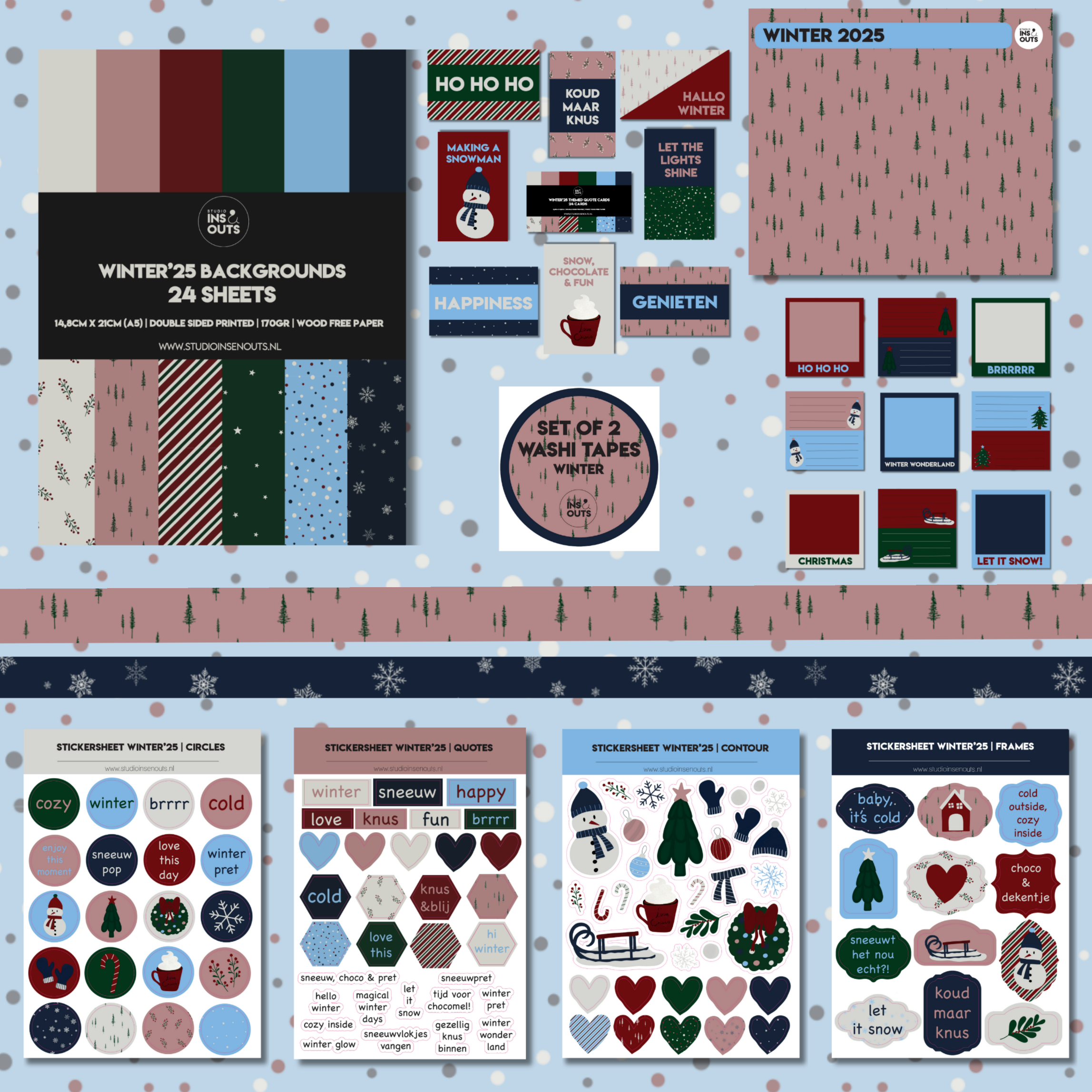 Het Paperpad Winter’25 van Studio Ins & Outs is een stijlvolle wintercollectie vol sfeervolle kleuren en prints. De combinatie van warme en koele tinten zoals donkergroen, bordeauxrood, ijsblauw en beige zorgt voor een gezellige en rustgevende uitstraling die perfect past bij de winter- en feestperiode.