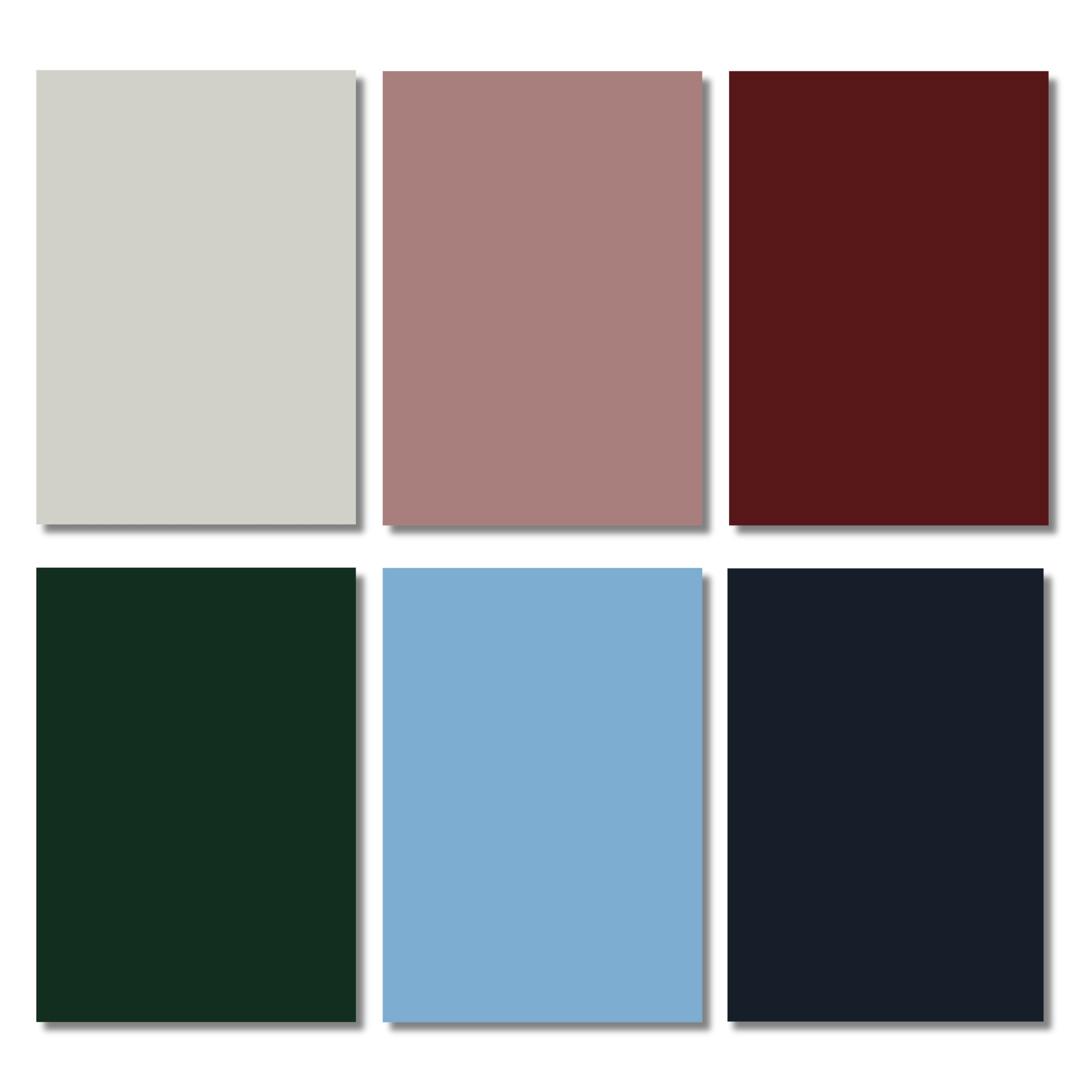 - Kleuren: beige, oudroze, bordeaux, donkergroen, ijsblauw en nachtblauw
