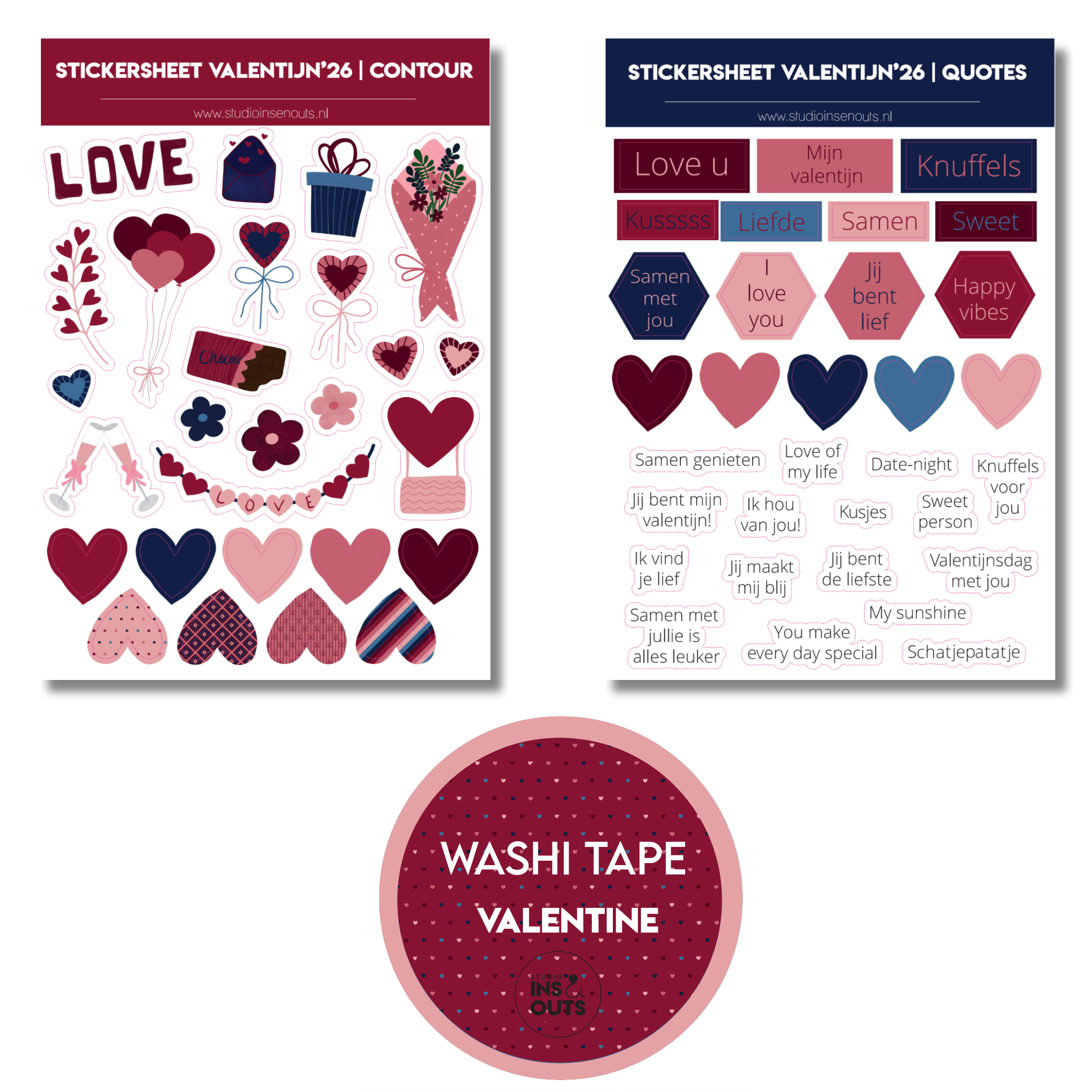 Deze liefdevolle mini collectie van Studio Ins & Outs is ontworpen voor Valentijnsdag en momenten die draaien om liefde, samen zijn en aandacht voor elkaar. De mini scrapbook set bevat twee bijpassende stickervellen en een brede washi tape van 1,5 cm met een subtiel hartjespatroon. Ideaal om je invulboek, scrapbook, plakboek of journal een warme Valentijnsuitstraling te geven.
