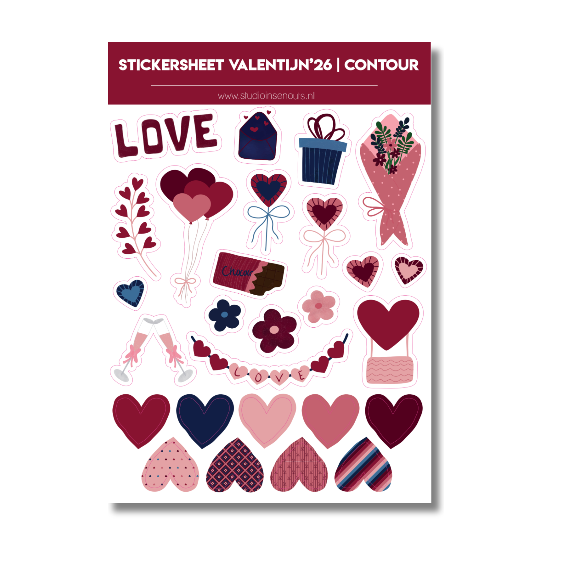 Het contourstickervel bevat illustraties die direct herkenbaar zijn voor Valentijn, zoals hartjes, bloemen en cadeautjes. De stickers zijn eenvoudig te combineren en passen goed bij zowel lichte als donkere achtergronden.
