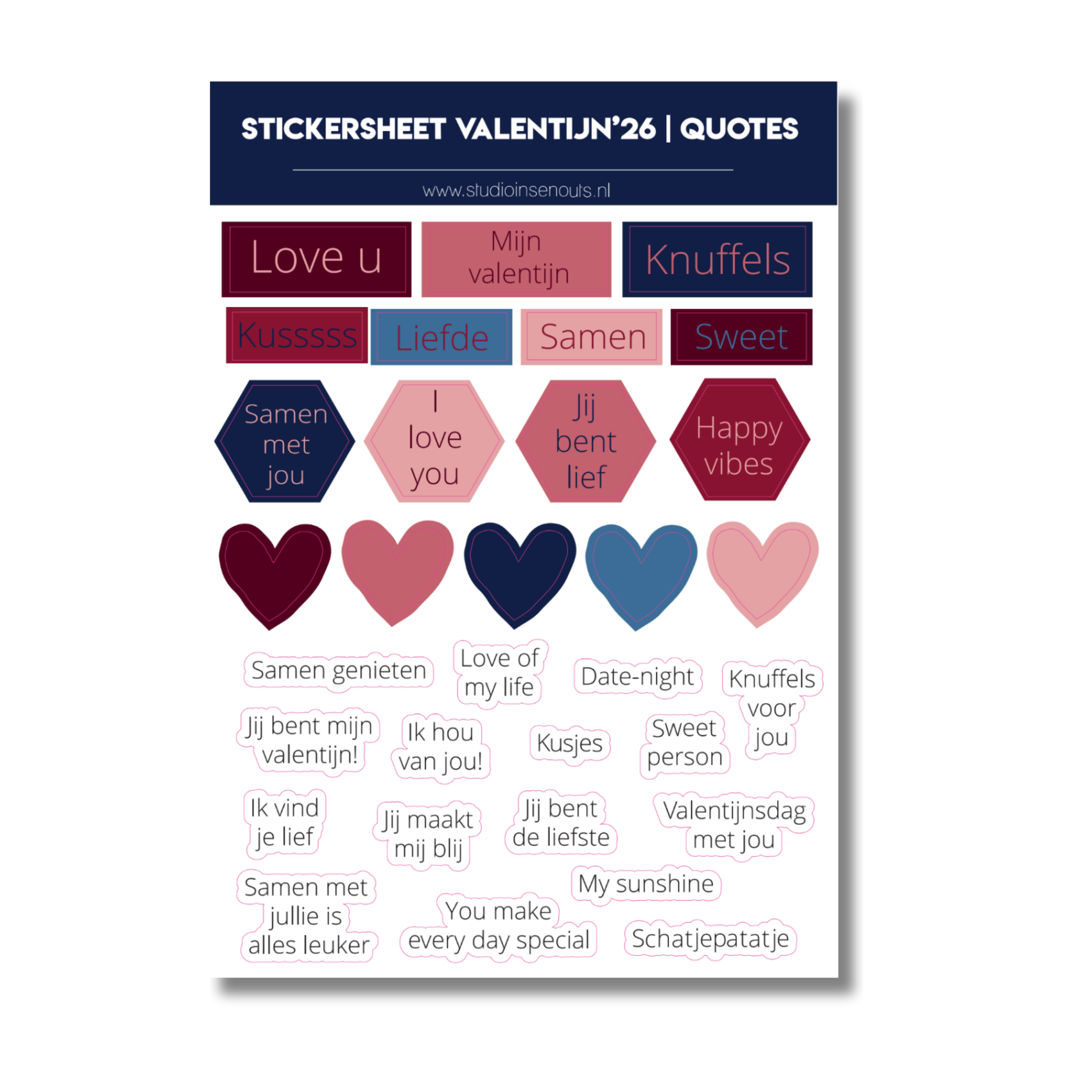 - Stickervel Quotes: met korte teksten en woorden rondom liefde en Valentijn, zoals “Love you”, “Mijn valentijn”, “Samen”, “Sweet” en “Date-night”.