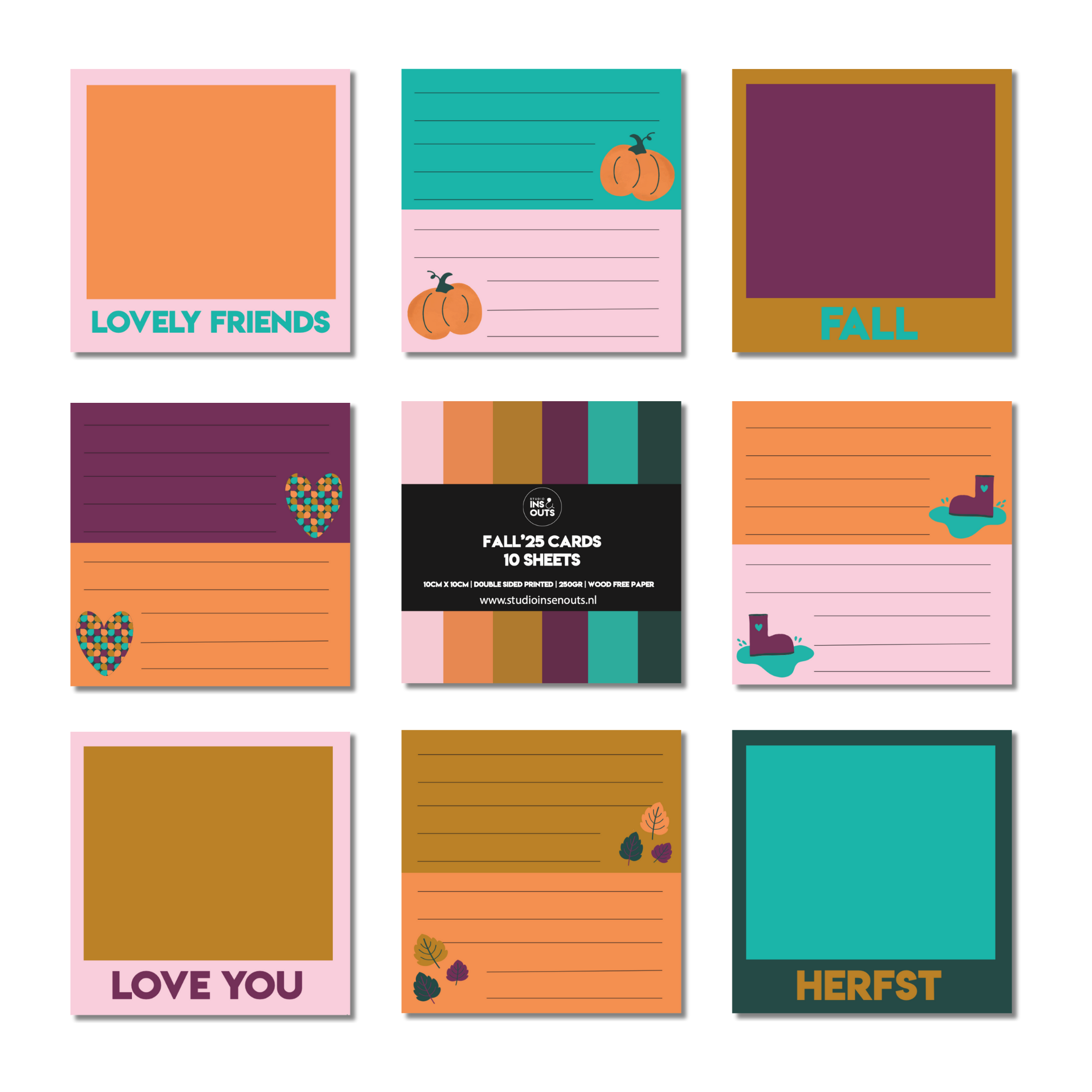 Vrolijke polaroid kaartjes uit de Fall’25 collectie van Studio Ins & Outs! Deze set bestaat uit 10 stevige kaartjes van 10x10 cm, perfect om te gebruiken in je invulboek of plakboek om bijzondere momenten vast te leggen, persoonlijke notities te schrijven of creatief aan de slag te gaan in je scrapbook of journal. De ene zijde van elk kaartje bevat fijne schrijflijntjes en een unieke illustratie of quote, zoals pompoenen, herfstbladeren, vogels en teksten als “LOVE YOU”, “HERFST” en “FALL”. Op de andere zijde is ruimte voor een foto of extra notitie, steeds in een kleurrijk ontwerp. De kleuren die gebruikt worden bij de polaroid kaartjes Fall’25 zijn oranje, bruin, roze, paars, groen en turquoise.