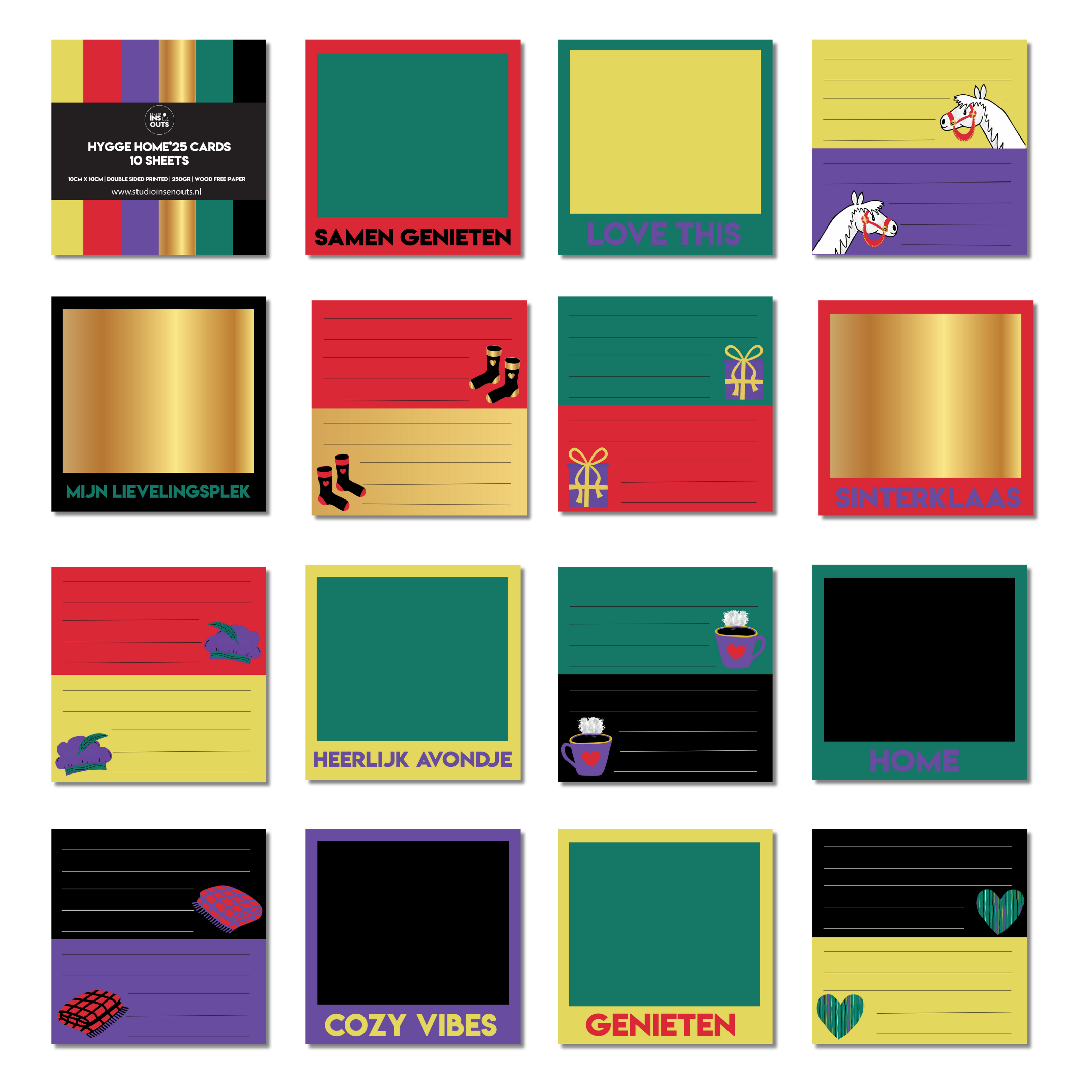 Gezellige polaroid kaartjes uit de Hygge Home’25 collectie van Studio Ins & Outs! Deze set bestaat uit 10 stevige kaartjes van 10x10 cm, perfect om te gebruiken in je invulboek of plakboek om knusse momenten vast te leggen, persoonlijke notities te schrijven of creatieve pagina’s te maken in je scrapbook of journal. De ene zijde van elk kaartje bevat schrijflijntjes en vrolijke illustraties zoals kopjes warme chocolademelk, hartjes, cadeautjes en sokken. De andere zijde biedt ruimte voor een foto of extra notitie, steeds in sfeervolle ontwerpen met quotes als “SAMEN GENIETEN”, “HEERLIJK AVONDJE”, “COZY VIBES” en “MIJN LIEVELINGSPLEK”. De kleuren van de Hygge Home’25 kaartjes zijn warm rood, goud, donkergroen, paars, geel en zwart — perfect voor de feestmaanden.