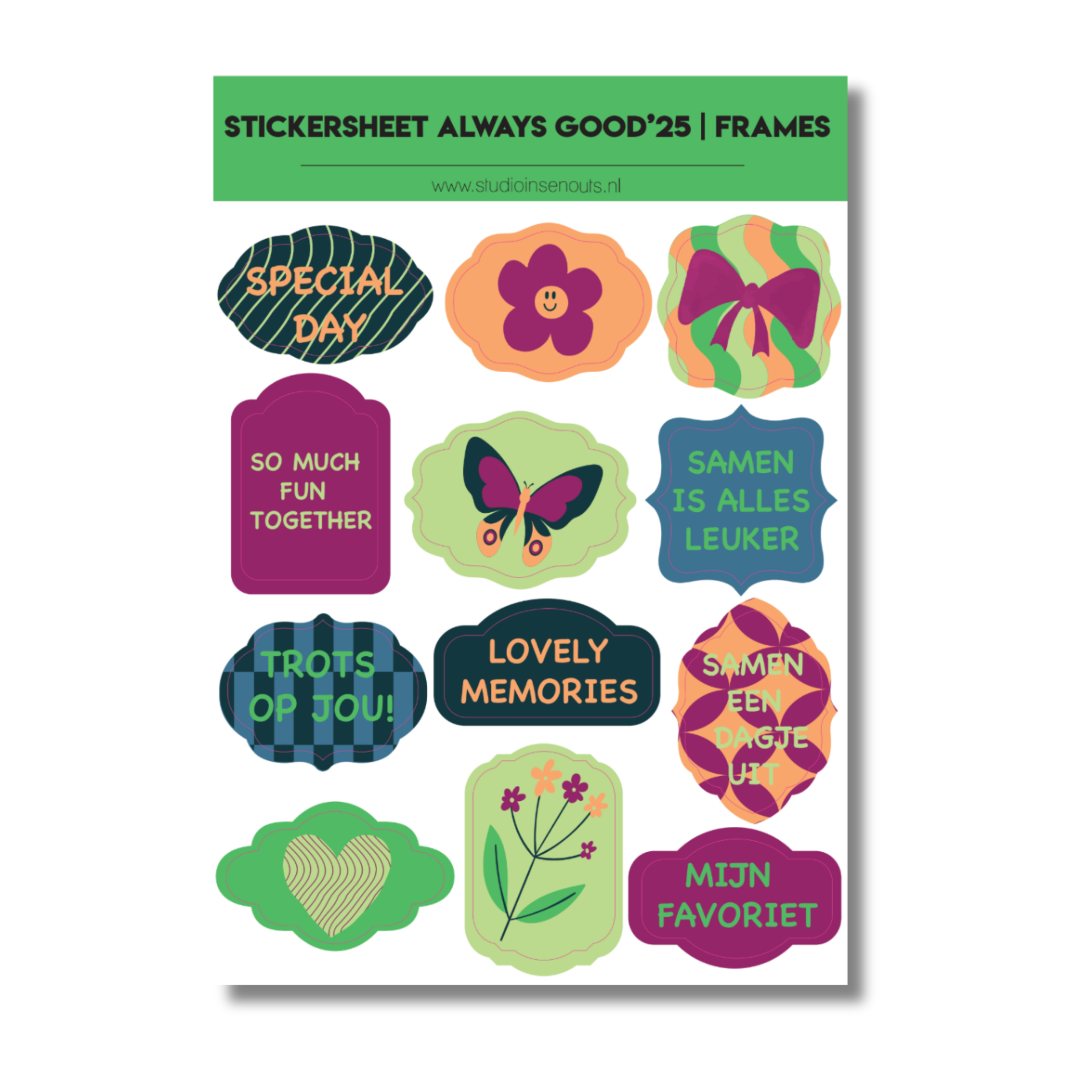 Deze stickers zijn onderdeel van de Always Good 2025 collectie en speciaal ontwikkeld voor invulboeken en fotoboeken van Studio Ins & Outs. Natuurlijk ook perfect als scrapbook stickers, journaling frames en tekststickers voor herinneringen, uitjes of vrolijke dagboeken. Combineer eenvoudig met andere stickers uit onze collectie voor een persoonlijk resultaat!